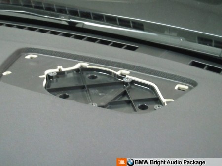 今回ご用命いただいたBMWブライトオーディオパッケージはF1をお選びいただきましたので、センタースピーカの設置は含まれておりませんが、車両の状態を見てみると、設置は可能なようです。