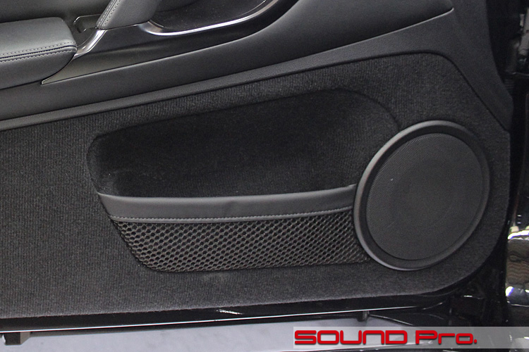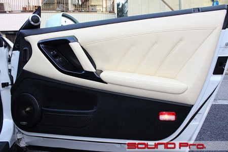 GT-R向けに先般リリースさせていただいたGT-R スーパーサウンドアッププログラムのV1フロントサウンドアッププランでは、デッドニングに加えて、標準車の場合はJBL製2wayユニットへの交換、BOSE車の場合は配線組み換えの上、スコーカーも交換という内容になっていますので、今回は更に上級グレードのスピーカーを使い、オプション設定しているアウターバッフル方式で施工した格好です。
