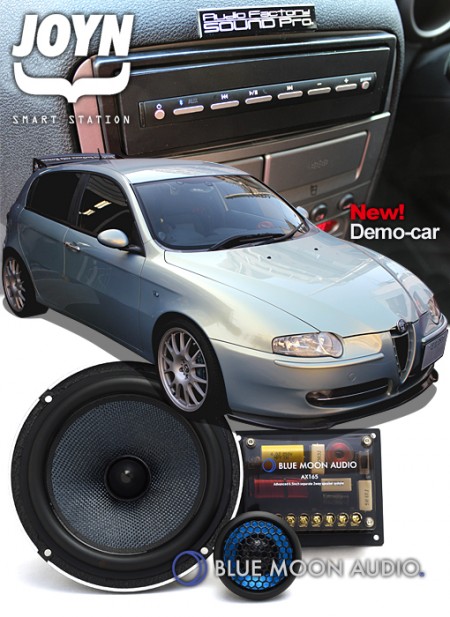 デモカーですので、搭載機器は、その時々の注目製品に置き換わってゆく運命にありますが、スタート段階としては、シンプルなインストール・操作が可能なJOYNをヘッドとし、話題のBLUE MOON AUDIOの2wayユニットをサウンドアッププログラムで取り付け、パワードサブウーファーで低域強化した、そこそこヤル気の感じられるシステムとなりました。