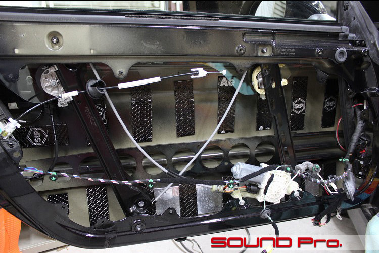 サイドエアバッグ、インナーパネル等すべてを戻して、FOCALのウーファーまでを取り付けてから、インナーパネル全面をstp GOLD AEROで覆います。
