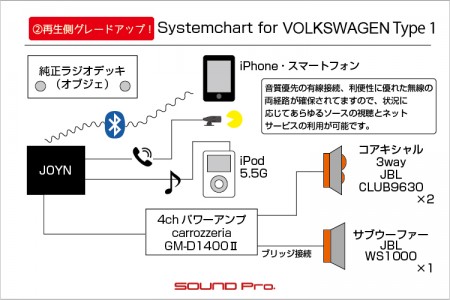 初回のシステムでは、FMモジュレーター経由でiPodのソースを純正ラジオに取り込み、モノラルの出力をリヤのスピーカー群に供給していましたが、再入庫時にJOYNにグレードアップしました。