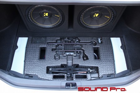 このスペアタイヤ収納スペースには、一枚物の発泡スチロールのフタが設けてあるのですが、重量のあるサブウーファーボックスが容易に動かせなくなる関係で、フロアボードを前後2分割で作り直したため、途中でカットしてあります。(グレーの断面が見えてますね)