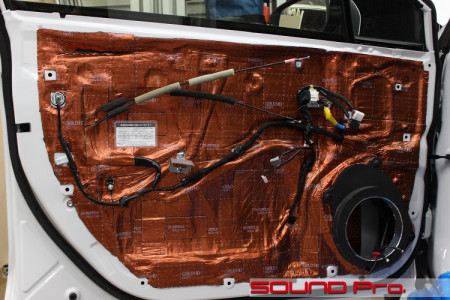 当店の防振メニューとして、(1)出力の低い内蔵アンプ向けには制振力のマイルドなドアチューニング、(2)出力の大きな外部アンプ向けには制振力が強いデッドニングと、おおきく2つを設定しておりますが、制振力がマイルド=箱の堅牢度も中程度な(1)については、ドア防振の基本的な効能は発揮させつつも、ある程度、ドアの共振も味方につけて音の広がりを演出することで、アンプの出力不足を補うようなバランスを目指しています。