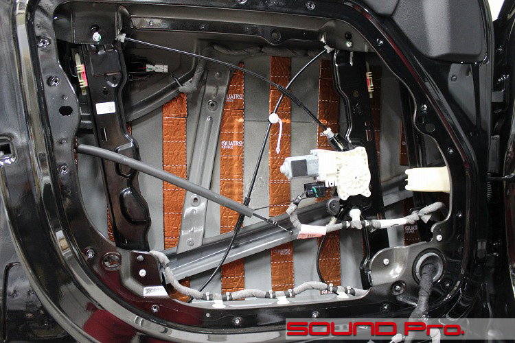通常、インナーパネルの防振は表側から施工しますが、この車の場合、ドアトリムとインナーパネルとの嵌合(かんごう・はめあい)がタイトなのと、両パネル間のクリアランスが狭いので、十分な量の防振材を貼れません。したがって、パネルの裏側から施工しています。