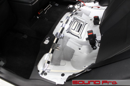 写真はリアシート下に左右に配線を渡しているところで、(写真の手前側の)助手席下のDSPアンプから、運転席側のスピーカー(ツイーター・ウーファー・リヤスピーカー)に繋がっています。