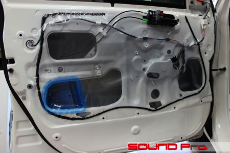 ドア筐体をエンクロージャー化するためのドア防振は、内蔵アンプでの駆動に合わせて、制振力のマイルドなドアチューニング・グレードで施工しました。
