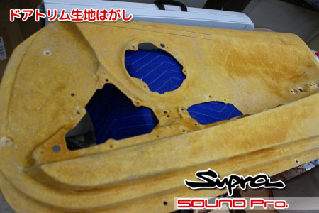 さらに、ドア側の2ユニットについて、カスタム製作したアルミ削り出しのバッフルリングを配置したほか、ドアトリムの「表皮」を剥離して、1枚ものの合皮でキレイに貼りなおしました。