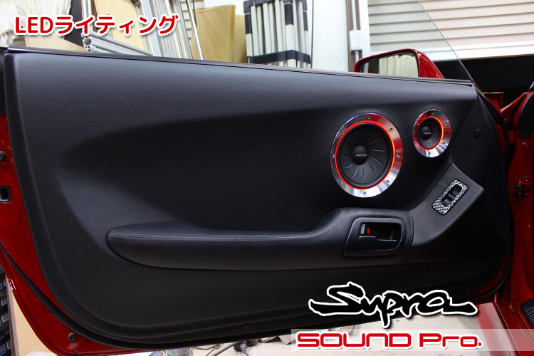ドアトリムを1枚モノの生地で張り替えて、スピーカーをアルミリングとLEDライトで演出した豪華仕様です♪