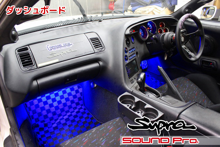 この型のスープラに関しては、リヤの大きなラゲッジルームがインストールスペースとして使えますので、サブウーファー、アンプといった大型アイテムを自由にレイアウトでき、LEDを入れれば、リヤウインドウ一杯に広がる光がエモさ満点!魅せるインストールの頂点と呼ぶにふさわしい世界が楽しめます。