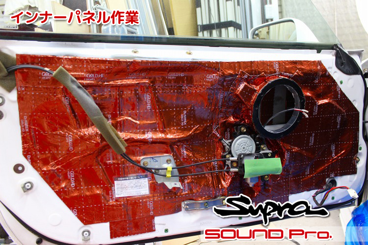 上出のオリジナルバッフルが固定した後、インナーパネル全面を防振材で覆います。