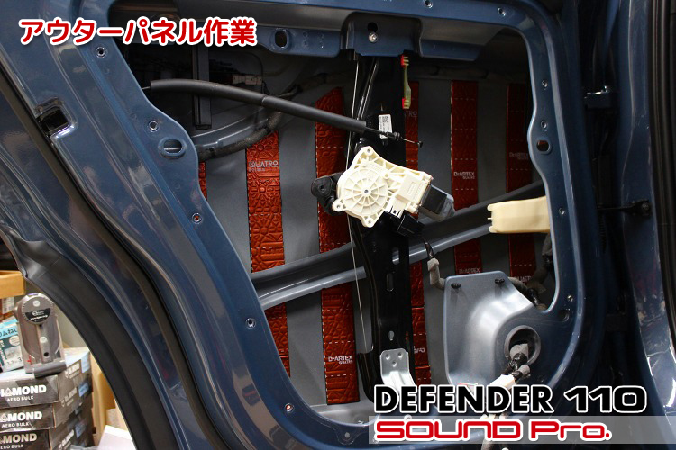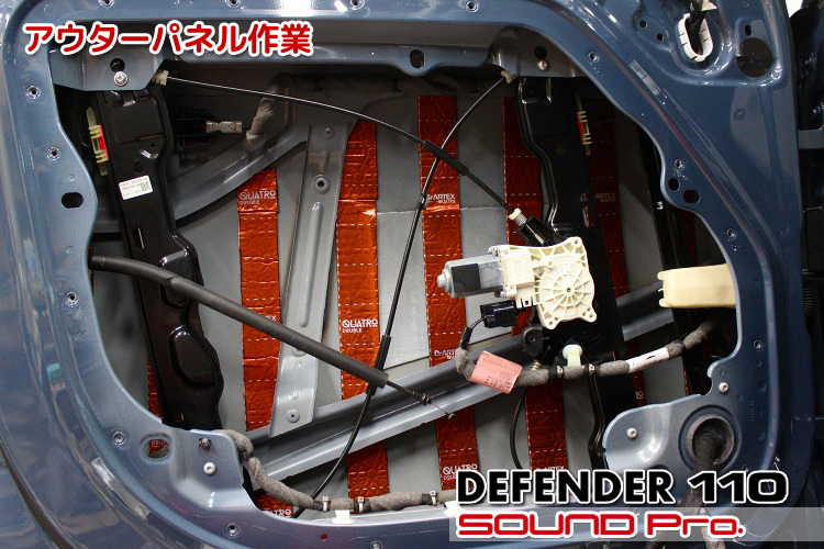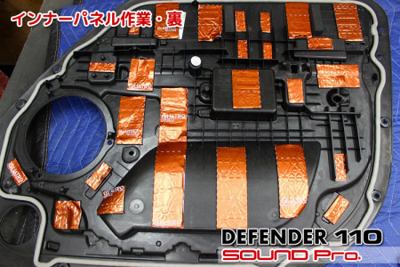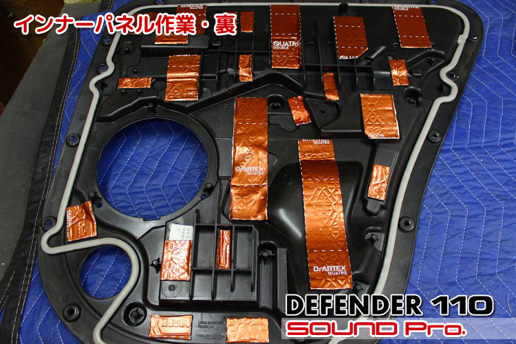 一般的なドアの造りですと、アウターパネル(ドアの外側の鉄板)と、インナーパネル(ドアの内側の穴あき鉄板)の2対象に対して防振材を貼り付けるのですが、ディフェンダーはインナーパネルならびにドアトリム(内装)の造りがちょっと変わっており、一般的な工法だとインナーパネル側に施工できる防振材の量が少なくなってしまうので、インナーパネルの表側のみならず裏側に対しても施工し、所定の防振性能を発揮させるのに十分な施工量を確保しました。