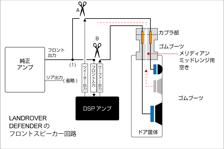 車両はフロント2way+リヤの6スピーカーの標準オーディオ車でしたので、このスピーカー構成のまま、マルチ化をするとなると、純正4chアンプの出力をDSPアンプに入力し、(社外品に交換した)各スピーカーに出力する。というシステム構成になります。