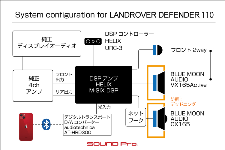 フロント2wayとリヤスピーカーをBLUE MOON AUDIOのスピーカーに交換し、デッドニングで整え、HELIXのDSPを追加し、オーディオテクニカのBluetoothインターフェースを入れました。