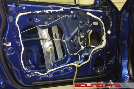 オーディオテクニカの防振材AT7550・7560を用いた定番のドアチューニングに加えて、AT7570の品番でリリースされている吸音材「ダイナミックドレイン」も施工しました。