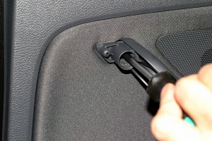 ドアハンドルのワイヤーを外します。前方のツメをゆっくりと手間に持ち上げ、後ろへ引きながら勘合を外します。力を入れすぎるとプラスチックを折ってしまうので気をつけます。