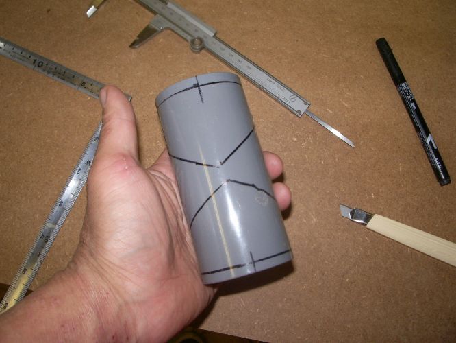 テープに引いた線をカッターで切り落とした後、始点と終点の位置を合わせながら再度パイプに貼り付けて、始点と終点をむすぶ直線を油性ペンでなぞります。